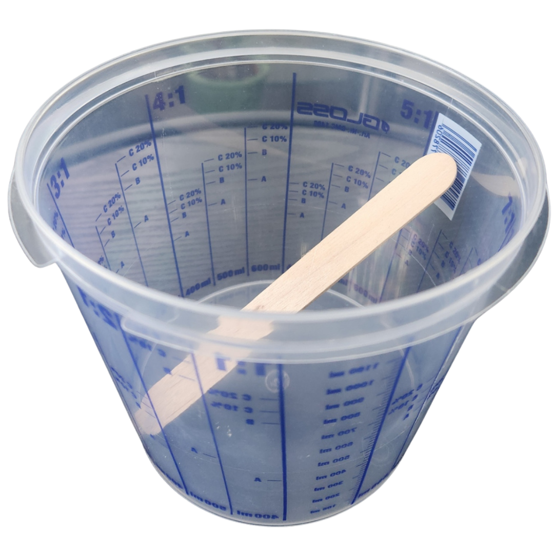 • 1 läpinäkyvä PVC-mitta-astia, sinisellä merkinnöillä