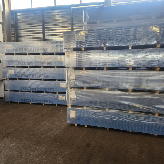 Määrä lavalla: 42 kipsilevyä, kokonaispinta-ala 151,2 m², tuulensuojakipsilevyjen kokonaispaino 1104 kg